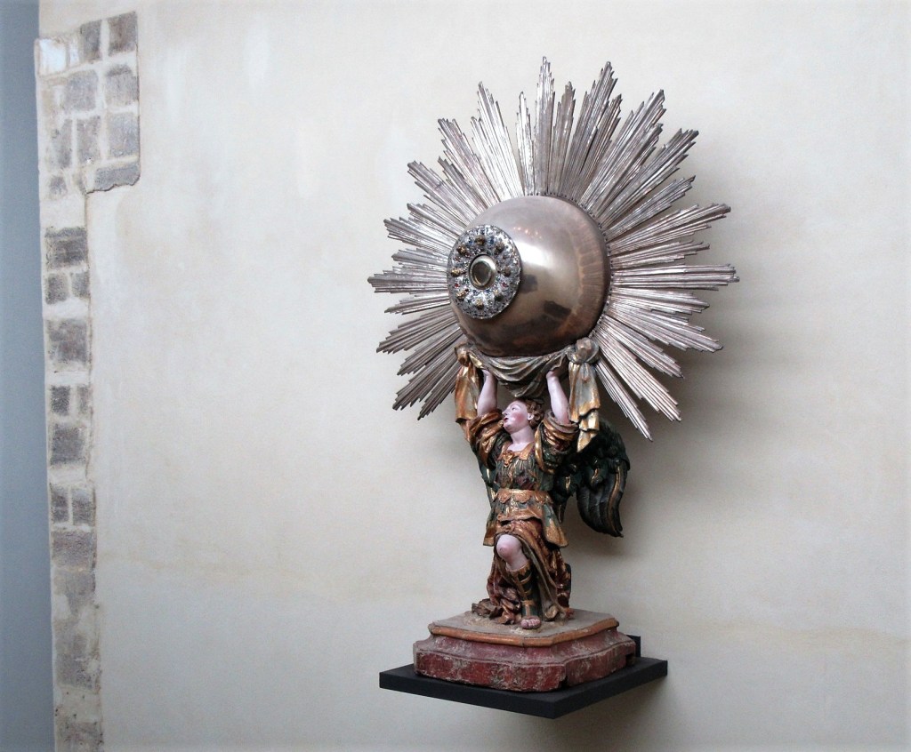Custódia do Sacramento. Esta linda peça do século XVIII é feita com madeira, prata, pedras preciosas e esmalte