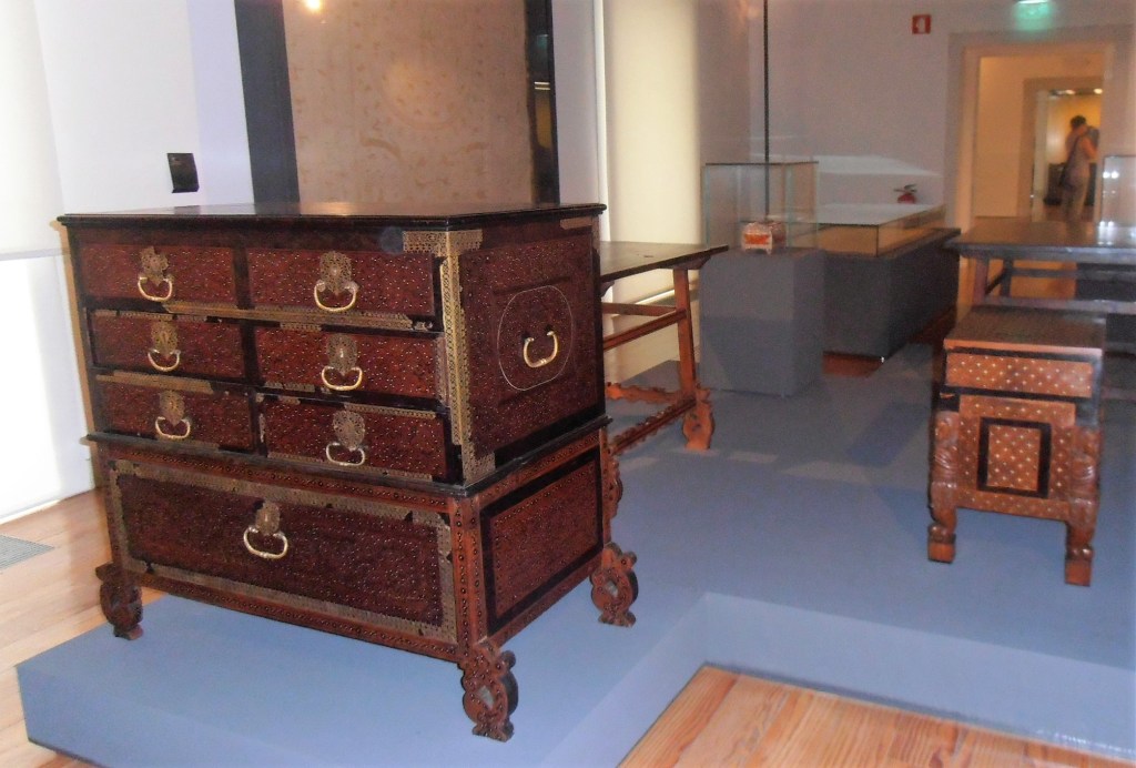 Mobiliário feito com madeiras nobres. Em primeiro plano, uma arca-contador de origem indo-portuguesa do século XVII