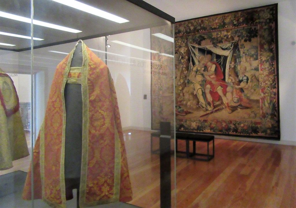 Vestes litúrgicas e ao fundo, uma tapeçaria representando Vénus e Marte surpreendidos por Vulcano