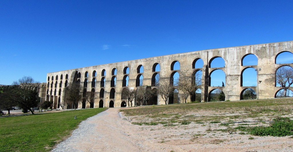 O Aqueduto da Amoreira é uma construção gigantesca iniciada no século XV. Com 12380 metros de extensão e 843 arcos, esta estrutura forneceu água à cidade até ao século XIX. Com receio que o inimigo se lembrasse de cortar a água, foi construída no seu interior uma cisterna com 56 metros de comprimento por 5 metros de largura e 8 metros de altura para reserva desse bem tão precioso. Esta cisterna continua a abastecer a cidade em tempo de seca.