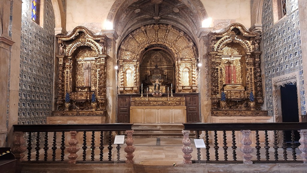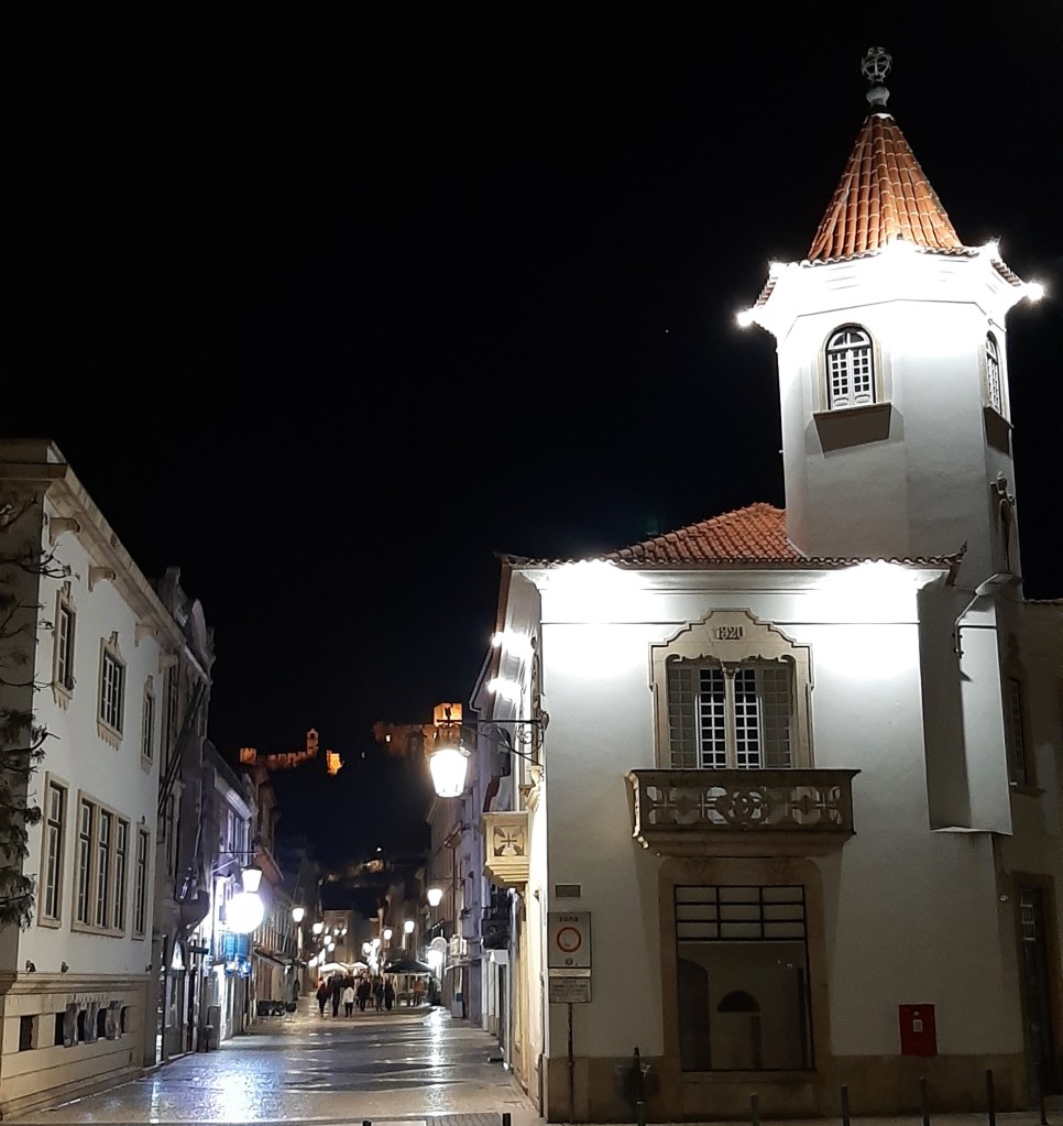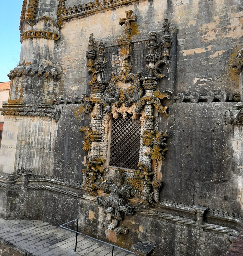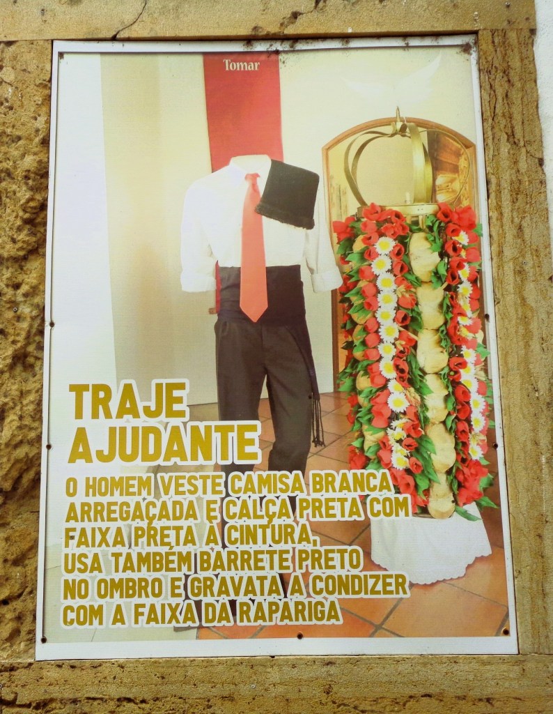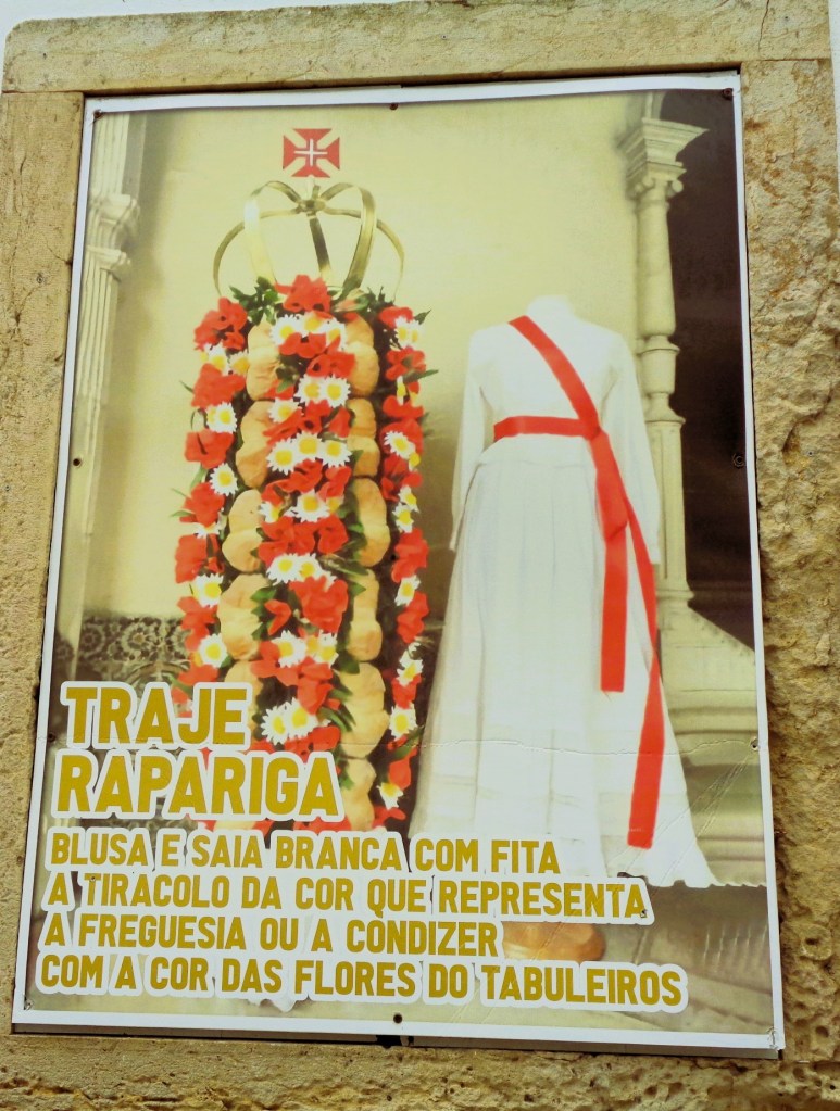 Deambulando pelas ruas, reparamos que os edifícios exibem muitos símbolos alusivos aos Templários e também várias fotos da Festa dos Tabuleiros que se realiza de 4 em 4 anos e é mundialmente conhecida! A próxima tem lugar em Julho de 2027. É uma das mais antigas festas do país, instituída pelo Rei D. Dinis no século XIII e pretende celebrar a fertilidade das terras e agradecer as colheitas. Os tabuleiros devem ter a altura de quem os transporta. São compostos por pães, trigo, flores e fitas e pesam em média 15kg! São encimados por uma coroa ou Cruz de Cristo. O efeito visual da procissão é um “hino de cor”!